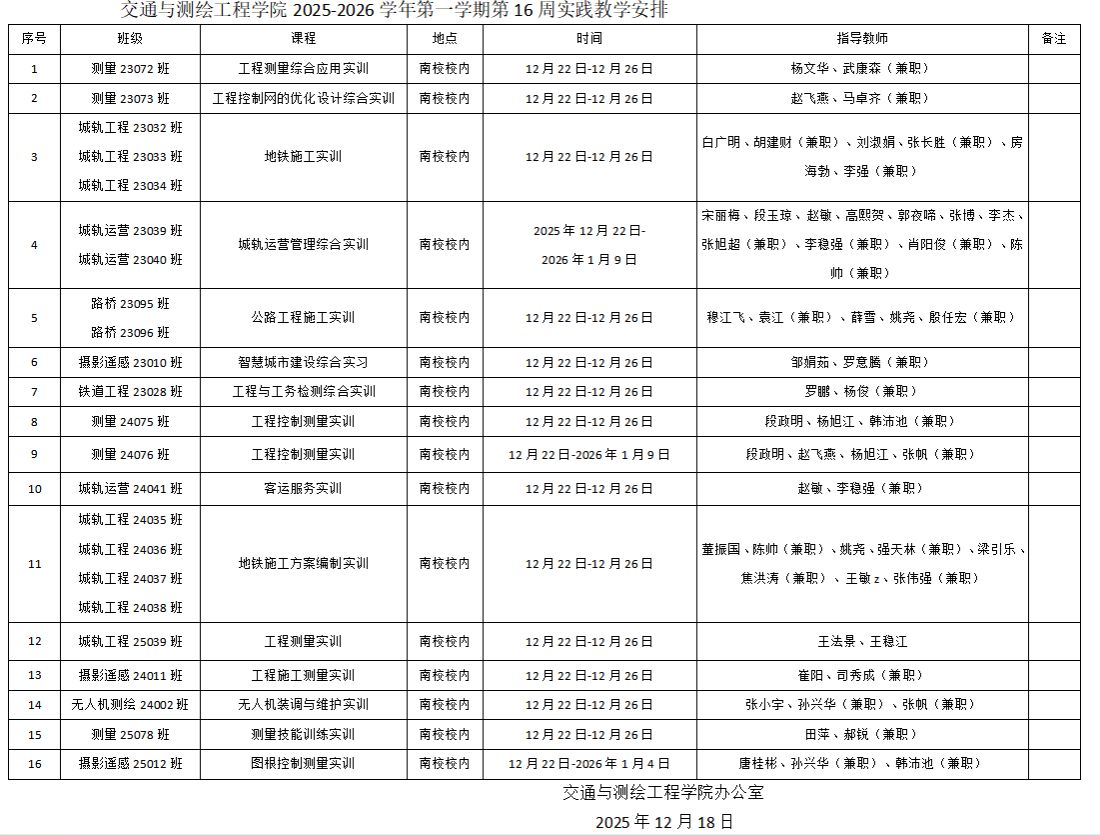 交通与测绘工程学院2025-2026学年第1学期第16周实践教学安排表