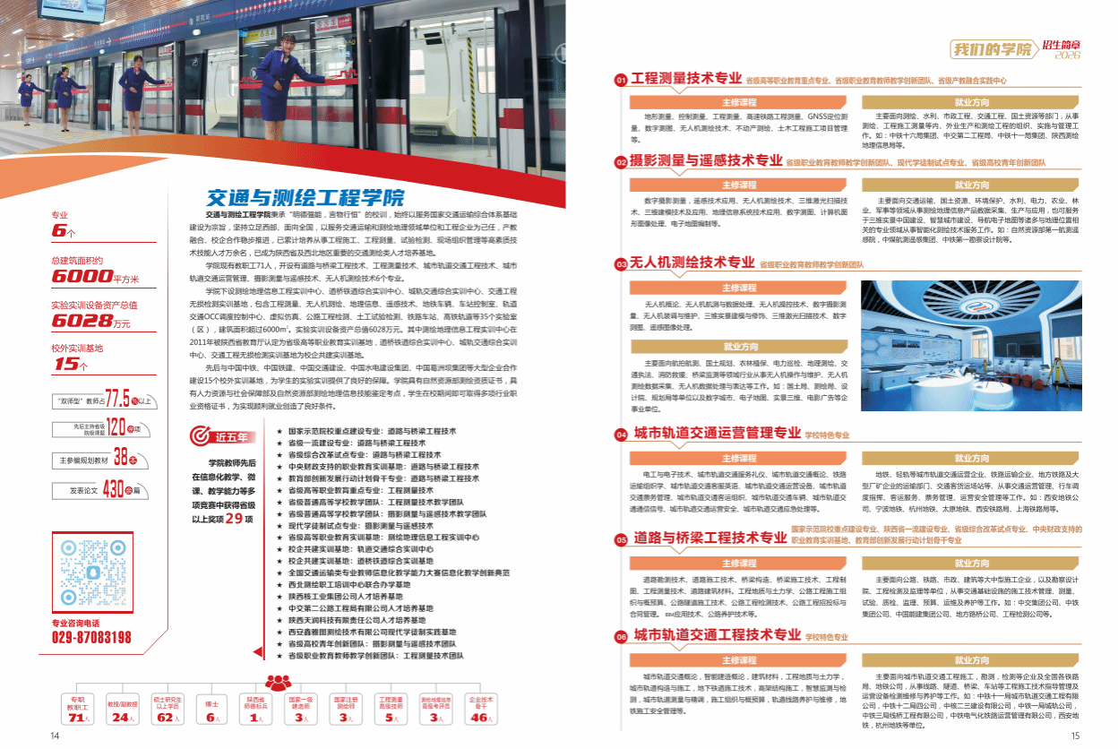 学院成立于2006年,开设有道路与桥梁工程技术、工程测量技术、城市轨道交通工程技术、城市轨道交通运营管理、摄影测量与遥感技术、无人机测绘技术、铁道工程技术7个专业,在校学生超过1400余名。拥有1个省级“专业综合改革试点”专业(道路与桥梁工程技术),1个省级高等职业教育重点专业(工程测量技术),1个中央财政支持职教实训基地(道路与桥梁工程实训中心),1个陕西省产教融合实践中心(智能测绘产教融合实践中心),1个省级高等职业教育实训基地(工程测量实训基地)。