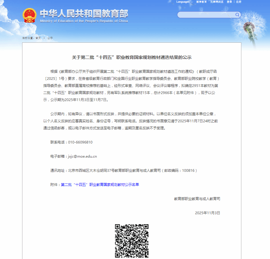此次教材入选第二批"十四五"职业教育国家级规划教材,实现了学院国规教材“零的突破”,标志着学院教材建设成绩再创新高,未来学院将继续开展教材建设和研究,确保优质教材进课堂,全面落实立德树人根本任务,不断推进内涵建设和高质量发展。