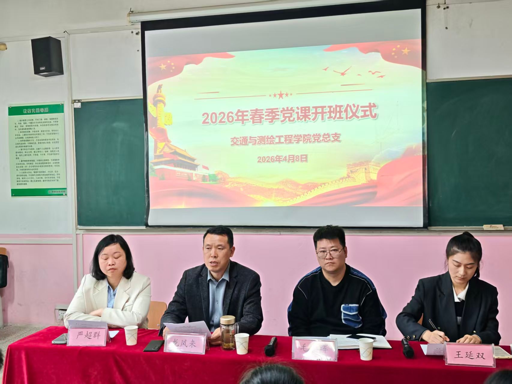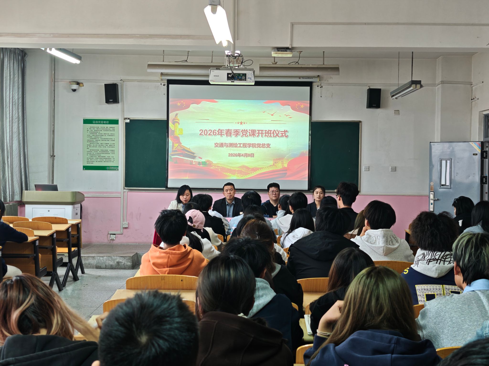 为了进一步提升我院入党积极分子政治素质,加强对党的理论知识系统的学习,端正入党动机,促进党的组织建设工作。4月8日,交通与测绘工程学院举行了2026年春季入党积极分子培训班开班仪式。交通与测绘工程学院党总支副书记龙凤来,党总支宣传委员、道路桥梁工程党支部书记、教研室主任严超群,学工办副主任毛晖,党总支组织员王延双,以及全体党课培训班学员参加了本次开班仪式。