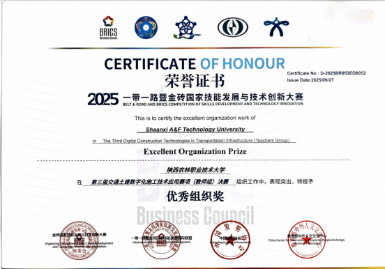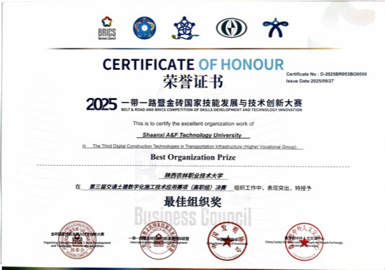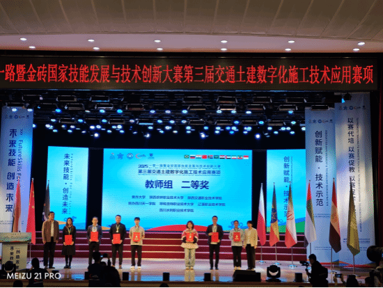 9月25日-27日,2025一带一路暨金砖国家技能发展与技术创新大赛“第三届交通土建数字化施工技术应用赛项”全国总决赛在哈尔滨铁道职业技术学院成功举办。本次赛事吸引了经区域赛选拔晋级的全国141所院校253支队伍同台竞技。经过激烈角逐,我院道路与桥梁工程技术专业董雄辉、黄家豪两名同学获得高职组一等奖,我院教师穆江飞老师获得教师组二等奖,学校获“最佳组织奖”、“优秀组织奖”,穆江飞和吴彩星两名指导教师获“优秀指导教师”。