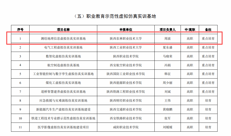 近日,陕西省教育厅公示 2025 年现代职业教育体系建设改革重点任务立项建设名单,我院周波老师主持的“测绘地理信息虚拟仿真实训基地” 项目成功入选。