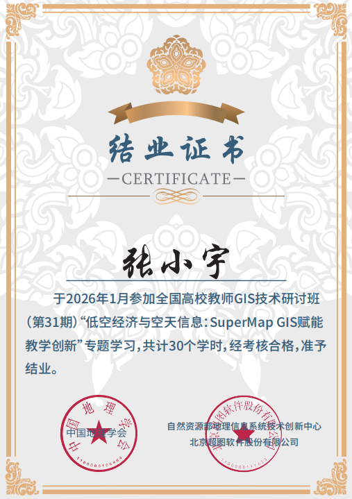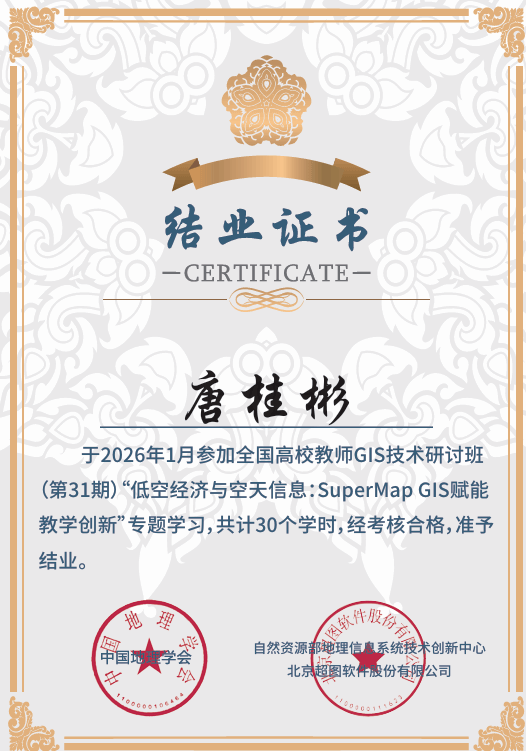 2026年1月19日至22日,我院教师唐桂彬、张小宇参加了由中国地理学会主办,自然资源部地理信息系统技术创新中心与北京超图软件股份有限公司协办的“2026寒假全国高校教师GIS技术研讨班(低空经济专题)”。本次培训以线上形式开展,聚焦低空经济与空天信息融合赋能教学创新,两位教师圆满完成学习任务,并取得结业证书。