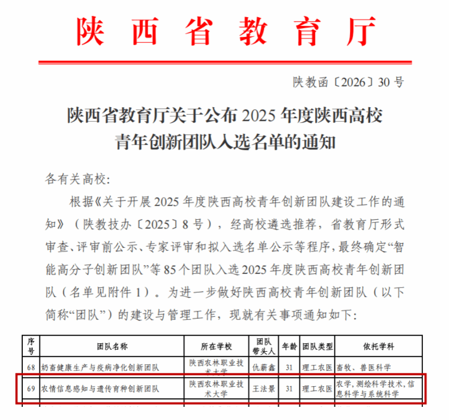 近日,陕西省教育厅正式发布了2025年陕西高校青年创新团队入选名单,我院王法景副教授牵头组建的“农情信息感知与遗传育种创新团队”成功入选。这一优异成绩是我院建院进程中的又一具有突破性、标志性的重大成果,意义非凡。