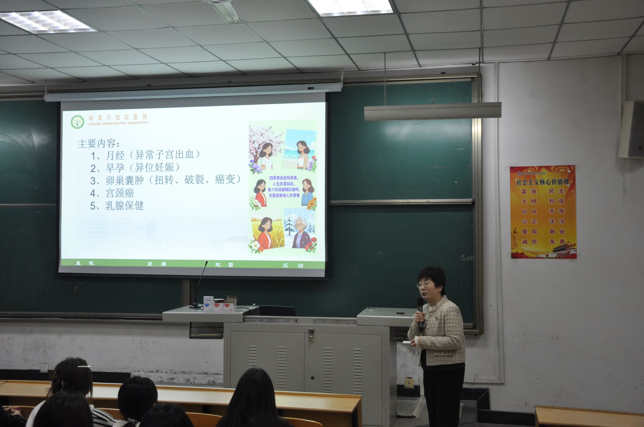 为切实加强对女学生的健康教育,引导女生树立科学健康观念、提升自我防护意识,4月9日晚学院在NOB103开展“关爱女生成长守护青春健康”专题讲座。本次讲座特邀杨凌示范区医院妇科主任何锦妮医生主讲,学院学工办副主任毛晖出席,辅导员李静主持,学院100名女生代表参加。