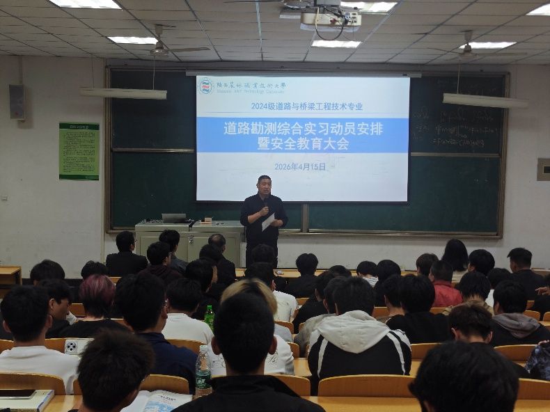 2026年4月15日,交通与测绘工程学院在南校区NOB123教室召开2024级道路与桥梁工程技术专业道路勘测实习动员大会。会议由道桥教研室主任严超群主持,2024级道桥专业全体学生、实习指导教师及辅导员参会。